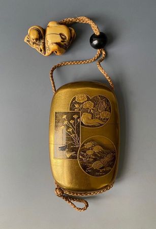Japanese antique lacquer inro with five reserve scenes of landscapes and implements most likely representing the Seven Lucky Gods. The inro has rounded edges and is almost oval in form. It has five sections (four compartments) and is lacquered entirely in very fine gold nashiji. There are 3 scenes on one side and 2 on the other in raised maki-e lacquer. The implements are displayed as if accidentally left behind. A biwa plectrum, a fan, various hats, an ancient turtle, are all symbols of the Lucky Gods. Signed by the artist.
