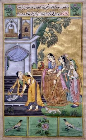 Antique Indian miniature panting of lady watching her maid kill a snake. The group of ladies, women with jewels and flowing saris look on with anxious expressions. The lush garden is inhabited with various birds and a cat. Mughal version of a Deccani school painting. Gouache and burnished gold on paper.