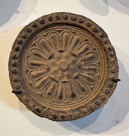 Antique Korean round fired roof tile. Depicting of a lotus flower. Dark Tones of brown and copper coming through. Very good original condition.