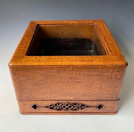 Antique Japanese square wooden hibachi. Made of momiji (maple) wood with beautiful bird's eye grain pattern. Intricate pierced carved floral motif on all four sides. Original copper insert. Deco era.