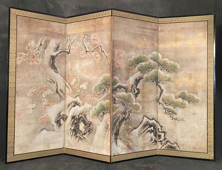 An antique Japanese screen in 4 panels. Hand painted image of an old pine tree, bamboo and plum blossom tree (known as Sho Chiku Bai-the 3 felicitous friends of winter) with Chrysanthemums, rock boulders and snow blanketing the scene. Artist seal on the left panel. Serene winter scene full of visual movement and energy. Painted on Gofun paper in Sumi and Rinpa paint with gold flex.