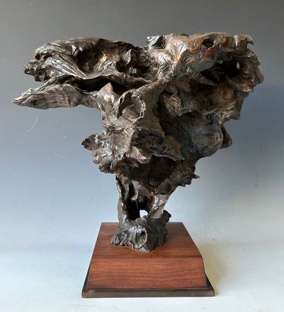 Antique Japanese naturally formed hardened burl wood stand. Cave-like structure to the burl shape, expanding out overhanging from its base. Top is flat, fitted to a custom base of bronze and cherry wood.