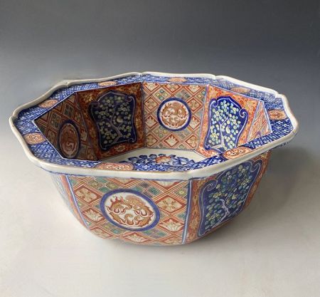 Large Japanese Imari bowl. Faceted form with 8 sides. Flared rim with foliate edge. Bright multi-colored glaze with gold dragon medallions alternating with bird in blossoming tree. Design of peony blossoms in the bottom. 6 character mark on the underside.