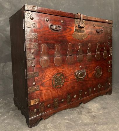 The chest features gourd-shaped brass appliqués, a symbol of prosperity and protection, while the circular medallions with stylized "Double Happiness" (囍) characters signify good fortune and marital bliss. The sturdy iron side handles allowed for easy transport, and the large central lockplate with a hinged clasp ensured secure storage. Reinforced brass corner brackets and decorative nailwork enhance both durability.