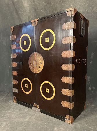 Antique Japanese dowry tansu (婚礼箪笥 - konrei tansu chest). Adorned with gold a set of fouor striking Kuginuki Mon (釘抜紋), also known as the Nail-Puller Crest, a symbol of strength, resilience, and unity. The mon features a square within a circle, repeated in four places on the front, traditionally representing a noble or samurai family.