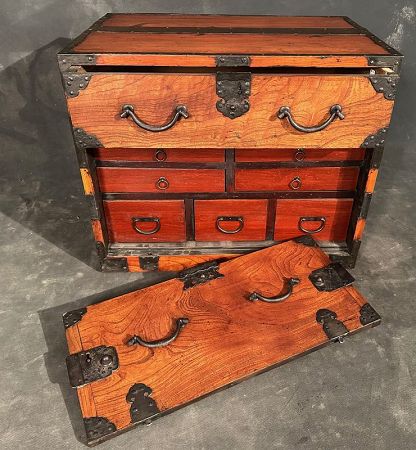 Antique edo-period Japanese funa tansu (captioan sea chest) was used on merchant vessels to store valuables and documents securely. The chest is made with a burl keyaki (zelkova) hardwood front and a sugi (cedar) body, reinforced with hand-forged iron hardware, including corner brackets, lock plates, and hand forged carrying handles.