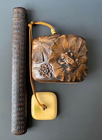 Antique Japanese tobacco case made of boxwood and carved with a frog and lotus. The tobacco pipe case is carved in two sections with a woven basket pattern and comes with a bamboo-handled pipe. A square shaped bone manju is attached. The tobacco case is signed: Takugetsu