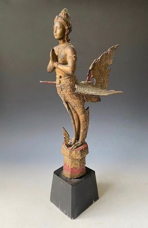 Antique Thai temple figure of Kinnari, the celestial female who, with her male counterpart, Kinnara, are guardians of the Kalpataru tree (Tree of Life). Kinnara-Kinnari are followers of Bathara Indra and are heavenly artists specializing in music and poetry. These heavenly beings symbolize faithfulness, grace and love while they watch over humans during times of trouble or danger. This figure is made of bronze and painted gold with red details. There are remnants of tiny multi-colored mirrors inlaid on the wings.