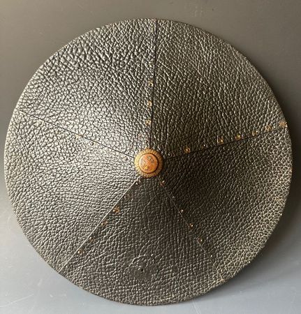 An unusual thick leather hide samurai jingasa hat. Stunning original textured finish, complete with copper hardware. Inside is lacquered dark original red tones. Some losses, overall very good condition.