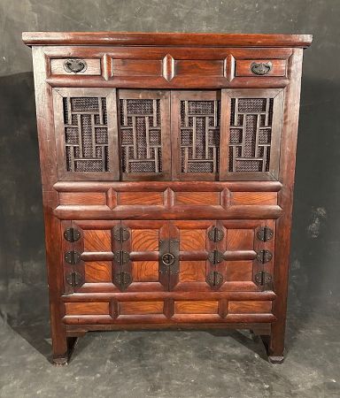 This antique Korean kitchen storage cabinet is constructed from hardwood and features intricately carved lattice panels in the upper section, allowing for ventilation while maintaining a decorative geometric pattern. The small drawers and compartments provide organized storage for utensils, dried goods, or kitchen essentials.