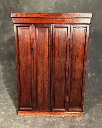This Japanese Butsudan shrine (Buddhist altar), traditionally used for housing religious artifacts, statues, and ritual offerings. Constructed from rose wood, the exterior features double doors with vertical lattice panels, while the top showcases a hand-carved transom (ranma) depicting a crane among clouds, symbolizing longevity and peace.