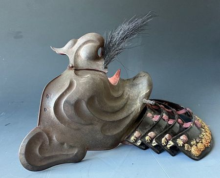 This unusual me-no-shita type (half face, literally “under the eyes”) samurai mask features a fine hammered surface that is embossed to create lengthy, deep, and sharp wrinkles across the entire face. The nose is rather large, and the chin has a very rare natural split indicating samurai had this as well as is indication menpo made by Myōchin armorers.