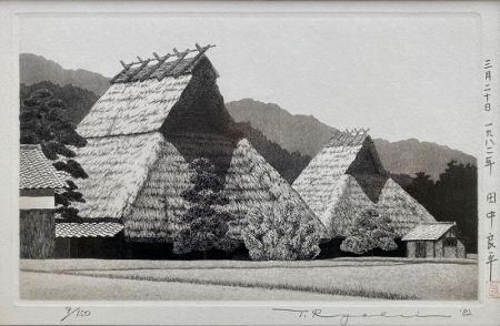 Japanese framed print of thatched farm houses and fields by artist Tanaka Ryohei, born in 1933 in Takatsuki City, Osaka Prefecture. He has appeared in numerous art exhibits all over the world and his collections may be viewed in many museums such as the Cincinnati Art Museum, Museum of Modern Art San Francisco, and the Shanghai, China Museum. The medium used for this print is copperplate etching. Signed in pencil and dated ’82. The left margin in Japanese states “March 20th, 1982 Ryohei Tanaka”. Numbered 9/150.