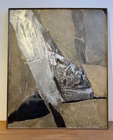 Crafted from torn and creased paper, the collage captures a landscape-like rhythm in a muted palette of gray, ivory, black, and earth tones. The surface has a tactile quality—subtle and weathered—evoking rock, ice, or misty reflections across water.