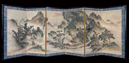 Japanese antique 6-panel screen painting of a mountain landscape by the artist, Yanagisawa Kien (1703-1758). A scholar and child walk along a path near a bridge. A stream runs underneath, traveling from high up in the mountains. Tall, rocky slopes reach for the sky and fade into the mist. Trees spring from crevices and ravines. There is writing on the 4th panel from the right.