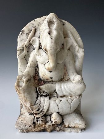 An expressive and time-worn Indian sculpture of Ganesha, hand-carved from solid white marble. This sacred figure of the elephant-headed deity is seated in a relaxed posture with one leg folded and the other extended, holding traditional attributes in his hands. Traces of original red pigment remain visible in crevices, hinting at the sculpture’s once vibrant devotional life.
