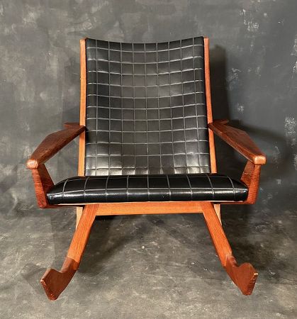 A rare "JET" rocking chair created by the artist Holger George Jensen and designed for Kubus. Made of Teak wood and Naugahyde, its winged armrests and chair back evokes an aerial flight. Its canoe style pontoon rocking feet with support struts gives the illusion of riding on a seaplane. Made by the Danish artist Holger Georg Jensen for Kubus.