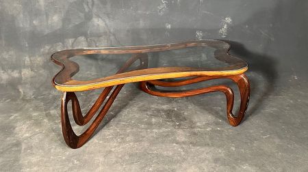 An original Jacaranda wood sculptural coffee table by the artist Giuseuppe Scapinellie. Brazil, 1950s; with inset glass top