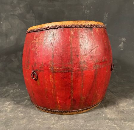 This striking antique Chinese barrel drum features a classic cylindrical form with a bold red lacquered body, exuding both energy and presence. The thick hide drumhead is stretched taut over the top and fastened securely with a ring of hand-hammered metal studs, showcasing traditional craftsmanship. This one is in playable condition and has a nice sound.