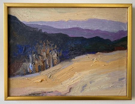 A landscape painting in oil by the artist Lundy Siegriest (1925-1985). A low mountain range in shades of lavender and yellow. Unsigned; inscriptions and numbered 36 verso.