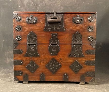 Korean antique bandaji (blanket storage chest). Made of so namu (pine wood) with original deep brown finish. Heavy iron hardware including handles with back plates in the form of bats for good luck. The trunk opens to a compartment lined with printed paper and with two small drawers.