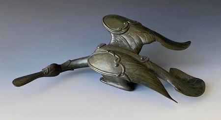 Bronze sculpture of a goose with wings partially spread, seated with long neck extended. Art Deco and Mid-Century Modern design with stylized raised swirling delineations on the wings suggesting traditional Asian motifs. Stamped on bottom "Santi's", dated 1980 and numbered 139/5000.