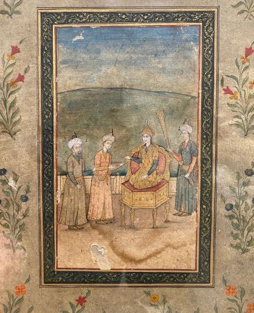 Indian antique miniature painting of two noblemen visiting a young Maharaja on an outdoor terrace. The young man sits on a throne and is fanned by an attendant. His tall crown with white feather finial denotes his royal status. The scene is edged with delicate scrolling vines in gold on black which is beautifully repeated on the wooden frame. The area between is decorated with colorful sprays of blossoming flowers. Painted in gouache and gold on paper.