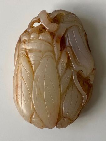 Chinese antique jade toggle in the form of a cicada. The large cicada clings to hangings seed pods. The reverse side is a giant leaf. The jade is white with russet striations. Has a nice weight and fits comfortably in hand. Cicadas are symbols of resurrection, transformation, and high status.