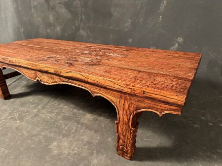 Chinese low table made from richly grained elm wood, showcasing deep natural textures and patina from age and use. The hand-carved apron features traditional scalloped edges and subtle curves, while the legs display chiseled scrollwork, all carved from solid wood.