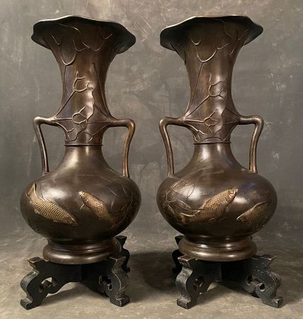 A pair of large antique bronze vases used for large Ikebana flower arrangements or Japanese entryway vessels. The base of each vase depicts an underwater scene of swimming Koi (carp) and bamboo growing out of the water. The base incorporates the stems of the lotus leaves hugging the neck and opening to the top scalloped rim.