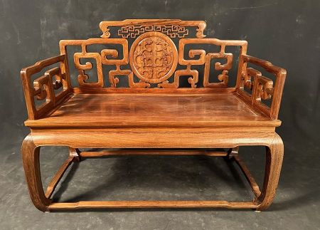 Chinese bench made of rich, figured Huanghuali wood, known for its deep tones and graceful ghostly grain. The backrest features an openwork design with intricate angular fretwork, flanking a central medallion intricately carved with the shou (longevity) character surrounded by stylized dragons—symbols of power and auspicious life.