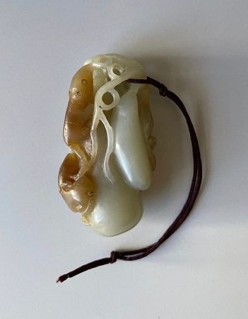 Chinese antique jade toggle carved of light green and brown jade in the form of a pair of rats and a bat on a vine hanging with long fruit. The rat in Chinese symbolism, in addition to being a zodiac animal of the lunar calendar, represents intelligence because of it's clever resourcefulness, prosperity and abundance. Along with the bat which symbolizes good luck and happiness.