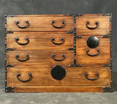 An antique Japanese Tansu chest called Kotansu made entirely of Kiri (Paulownia) wood. All original bronze hardware and constructed using Japanese joinery techniques and hardened wood nails. 6 drawer configuration. Perfect companion for any desktop in need of organized storage.