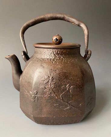 Japanese antique tetsubin, cast iron kettle for heating water for tea. Each side is decorated with a raised design of blossoming branches: one with a plum or cherry, the other with a buds about to flower, likely a camellia. The lid is cast in bronze and has a mottled reddish patina.