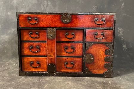 Original antique Japanese ko-tansu (small chest) featuring a beautifully grained burl keyaki (zelkova) wood front with a warm, rich patina. This Sendai-style tansu is fitted with its original forged iron hardware, including butterfly-style hinges on hinged safe compartment. The arrangement of drawers and a locking compartment reflects its practical function, originally used to store valuables and personal items.