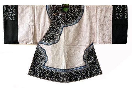 Chinese antique silk robe for a lady. Wide edging of black silk embroidered with tiny flowers and butterflies in blue and purple. A pink/white ground with subtle leiwen cloud and thunder pattern and plum blossoms. The inside is lined with a vibrant apple-green silk.