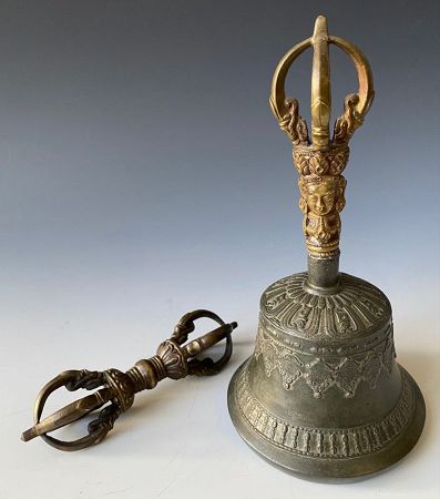 An antique Tibetan temple bell and Vajra both made of bronze. Four prong bronze bell and matching four prong bronze vajra (diamond / thunderbolt). Beautiful design with ritual wear.