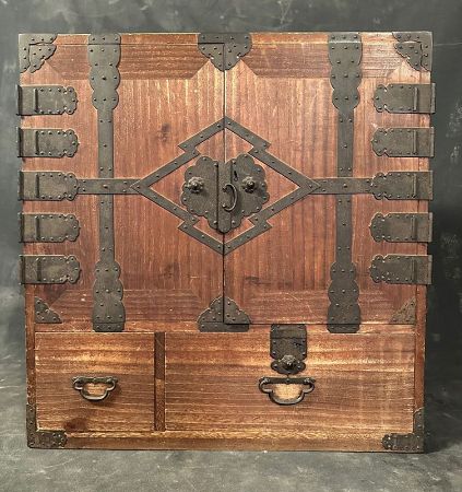 An antique Ko Tansu (small chest), traditionally used personal secures storage. Made from Kiri (paulownia) wood and is reinforced with hand-forged iron hardware, including elaborate corner bracing, stylized lock plates, and classic warabite-style drawer pulls.
