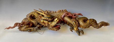 Japanese antique carving of a dragon. Carved of hinoki wood, lacquered and painted with gold and polychrome mineral pigments. This dragon once graced the inside of a Buddhist shrine in a prominent household or temple. Both the carving and the painting is masterfully done with details to the individual scales, long metal whiskers and reverse-painted-glass eyes.