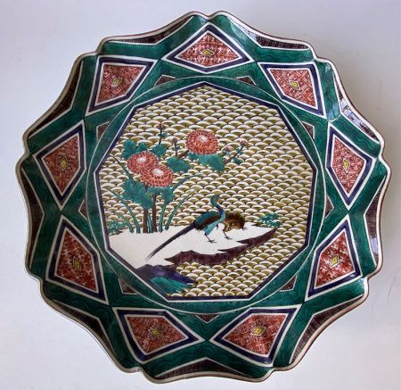 Striking antique kutani yaki (九谷焼) plate featuring a central image of pheasants beneath blooming chrysanthemums, symbols of nobility and longevity in Japanese art. The design is set against a geometric scale-patterned background, bordered by vivid alternating green, red, and gold geometric motifs, and presented on a scalloped rim form.