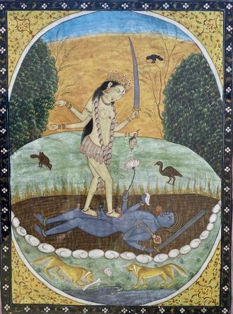 Indian antique miniature painting of the Hindu goddess, Kali portrayed here standing on her husband, the Lord Shiva. Kali is the divine feminine, Shakti (power) of Shiva. She is the fierce and powerful goddess of time, destruction and creation and is worshipped for her strength and protection.