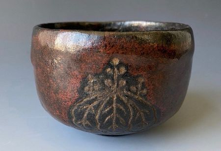 Japanese antique Kyoto raku ware chawan tea bowl with black and red glaze. Decorated with two kiri blossoms; one large and one smaller. The flowers are the bare clay of the bowl. The glaze has been thickly applied, resulting in a lush dripping effect. Probably by Iohiniu. Collector's label #2.