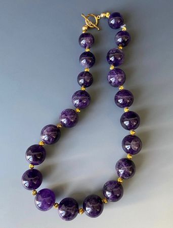 Chinese necklace made of 20 round amethyst beads. Deep purple color with areas of translucency and quartz striations.