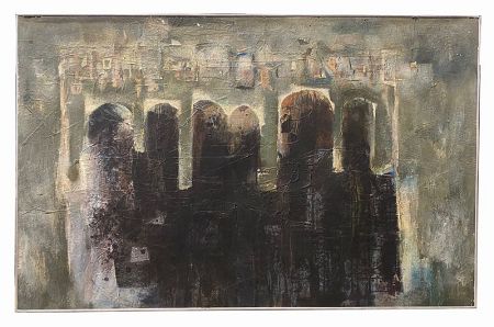 An abstract painting titled "Somnambule" (Sleepwalker) by the American artist Murray Jones (1915-1964). Lacquer on masonite, titled, signed, and dated "1956 #10" verso.
