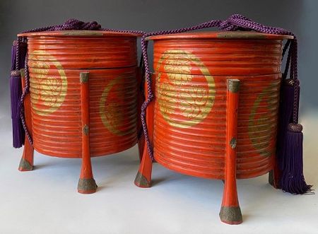 Japanese antique pair of round form hokkai, lidded containers for Ka-awase shell game. Each box stands on four feet and has horizontal ribbed sides. Lacquered red and decorated with large gold lacquer Aoi (hollyhock) crests. Tied with long purple silk cords and fitted with copper hardware.
