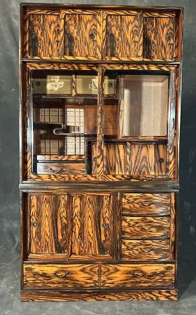 A beautifully crafted two-section Japanese cha tansu (tea chest. Featuring striking quarter sawn persimmon wood with bold natural grain patterns. Designed for tea service and everyday use, the upper section includes a variety of sliding doors—glass, wood, and shoji-style panels—as well as open shelving and display areas. The lower section provides ample storage with sliding doors and multiple drawers, all fitted with original bronze hardware.