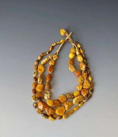 Set of 3 strands of beautiful yellow Baltic amber. One section has a double strand and is intricately knotted near the clasp. The accent strand can be worn alone or in addition to the double-stranded necklace. All with amber of varying one-yellow color in dramatic natural striations.