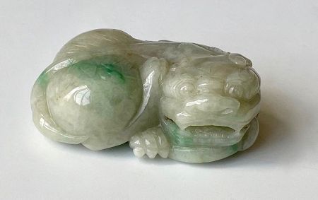 Chinese jadeite carving of a fu dog crouched on a large coin. Carved of lovely white and apple-green natural jadeite. The fu dog symbolizes protection while the coin represents wealth. Together they make a strong talisman for prosperity and good fortune.