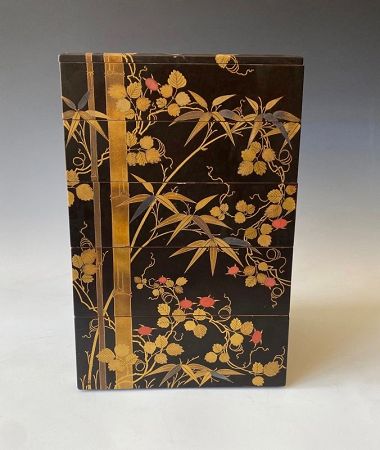 Japanese antique maki-e lacquer jūbako, tiered boxes for food. Made up of five square compartments and a lid. The lacquer design is of bamboo and tendrils of berry vines (either Japanese wineberry or raspberry) in gold and red lacquer on a black ground. The insides of the boxes are lacquered an orangish-red.