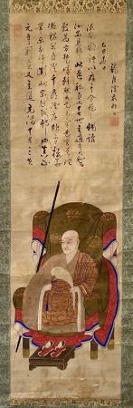 Japanese antique scroll painting of a seated Buddhist priest. He holds a fly whisk in his hands. His walking stick for pilgrimages rests against the back of his chair and his red slippers sit on a lacquered footrest. He is draped in a kesa of sewn-together sections of orange and gold cloth. Buddhist calligraphy is written on the upper portion of the image. On the outside of the scroll is a written title "Daiosho Gendo Toru" which generally translates as "Great Priest of the Profound Path"
